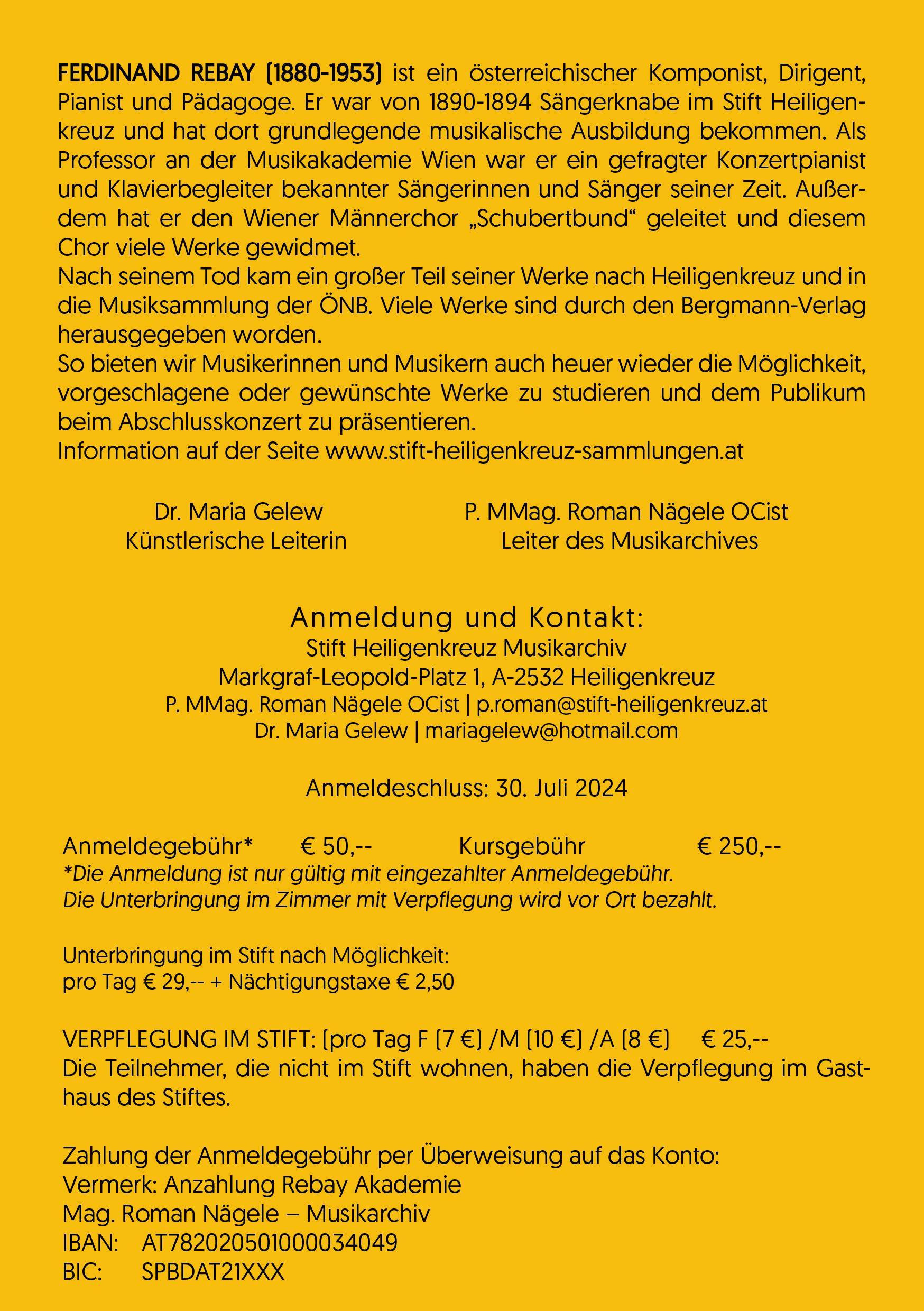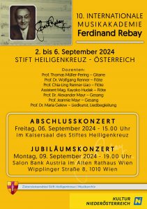 Das Stift Heiligenkreuz lädt zum siebten Mal in das Stift Heiligenkreuz ein, wo die alten Kunstschätze des Stiftes und die Landschaft des Wienerwaldes zur Kulisse eines Meisterkurses mit Abschlusskonzert werden. Bei dieser Musikakademie stehen Werke von Ferdinand Rebay im Mittelpunkt. Rebay hatte einen starken persönlichen Bezug zu Heiligenkreuz. Er hat hier von 1890 bis 1894 als Sängerknabe grundlegende Musikkenntnisse erworben. Viele Jahre später kam der Großteil seiner Werke hierher nach Heiligenkreuz.
